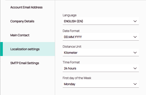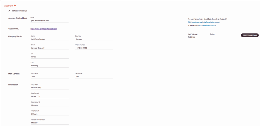 Under this tab you can configure account settings. You can check and edit your account details in this menu, like your account email address, your company details, and your main Fieldcode contact.