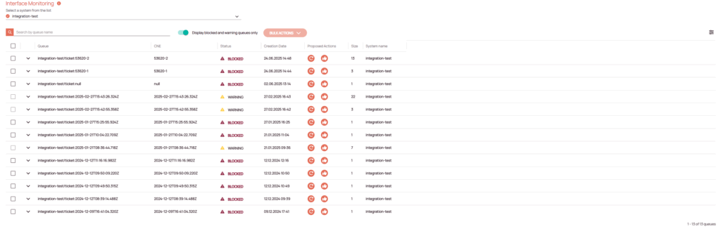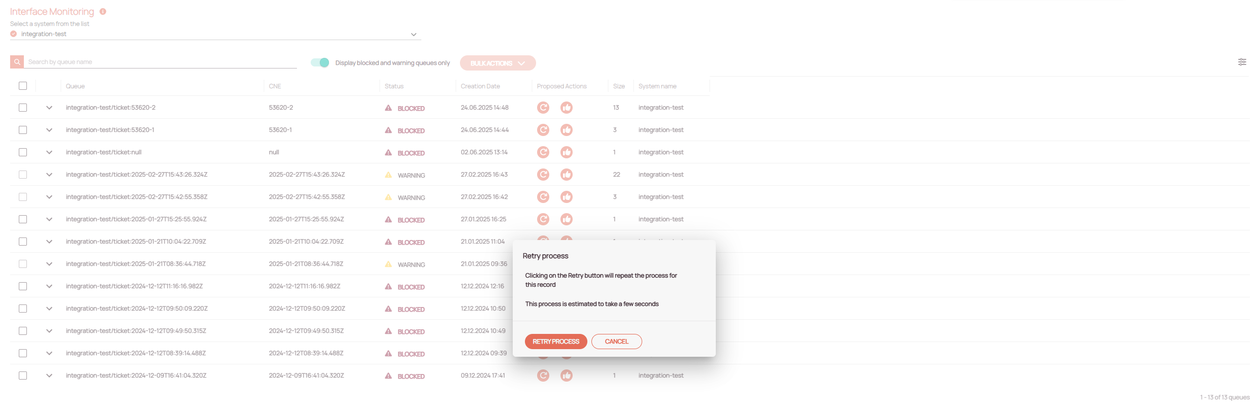 The Interface Monitoring page allows you to check and troubleshoot all your existing interface connections. You can monitor multiple connections to ensure they are functioning correctly. Monitoring is organized into queues and processes: