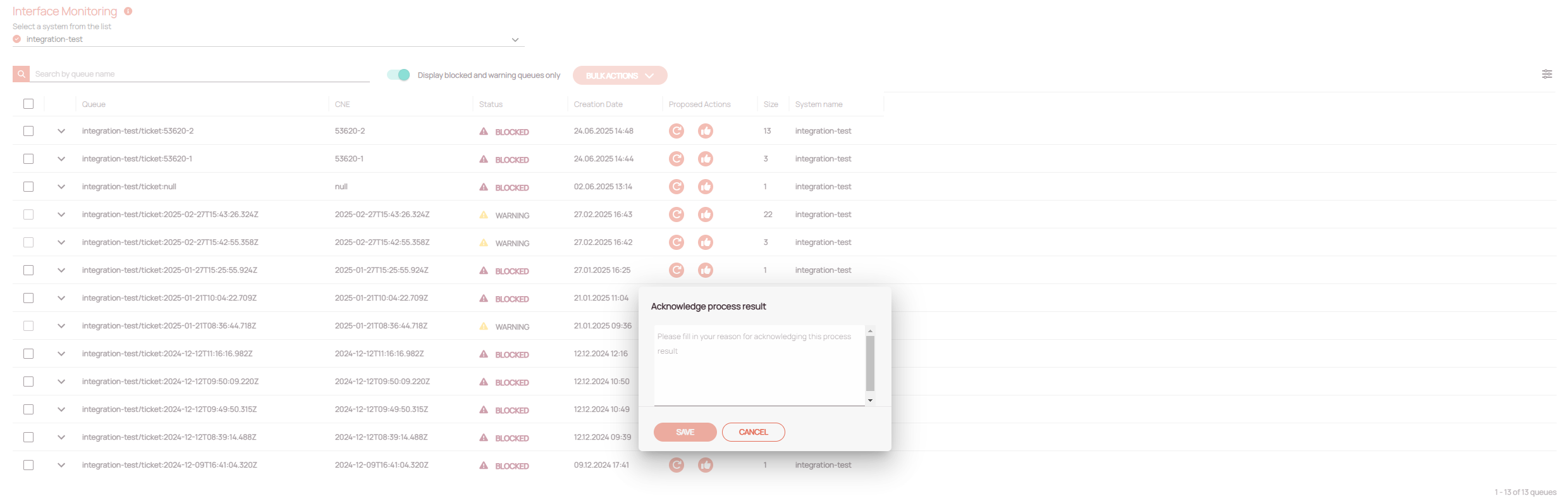 - 📝 ACKNOWLEDGED: The queue contains a “Acknowledge process result”.